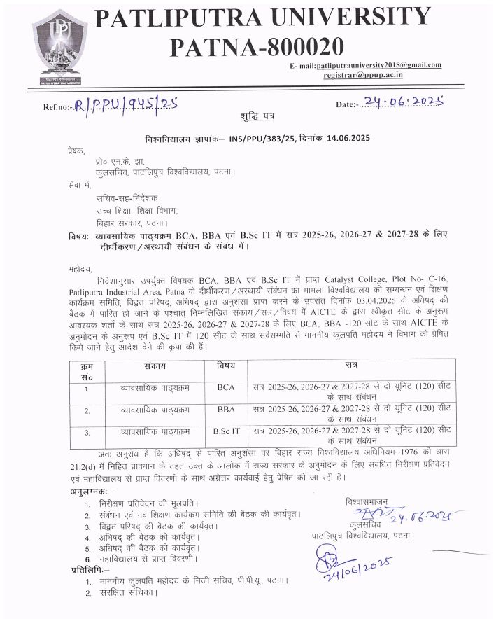 Catalyst College, Patna is proudly affiliated with Patliputra University (PPU), Patna, Bihar. This affiliation ensures that all our academic programs adhere to the highest standards of quality education and are duly recognized by the Government of Bihar, providing students with credible, respected, and widely accepted degrees.
