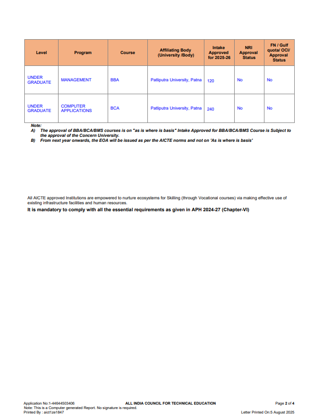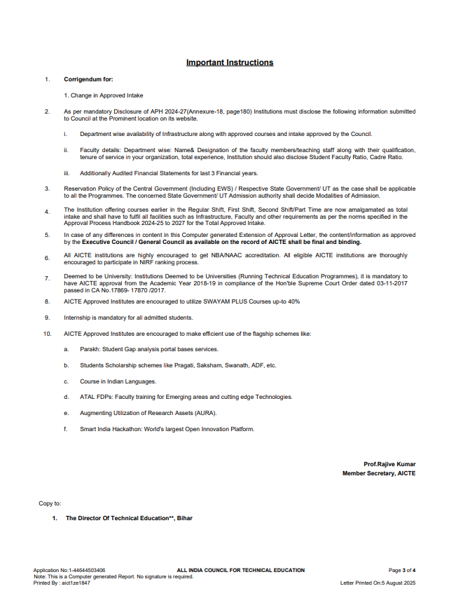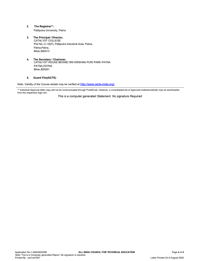 Catalyst College, Patna is approved by the All India Council for Technical Education (AICTE) for offering technical education programs. This approval validates our infrastructure, faculty qualifications, and adherence to national education standards.