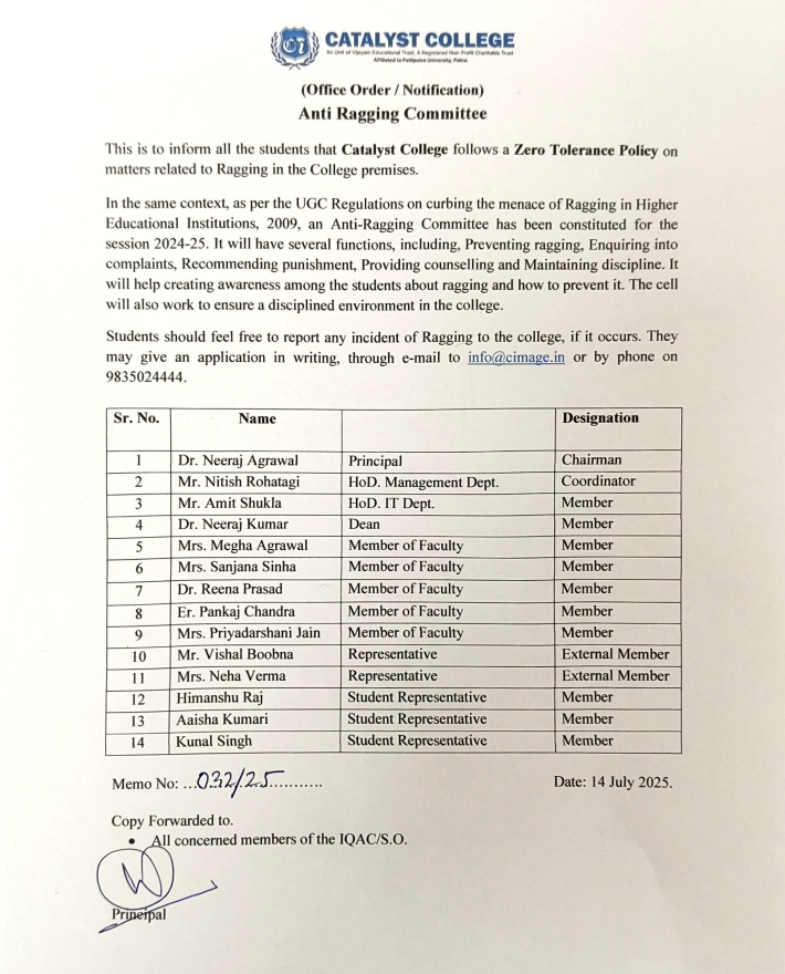 Catalyst College follows a strict zero-tolerance policy towards ragging and is committed to providing a safe, inclusive, and intellectually enriching environment for all students.