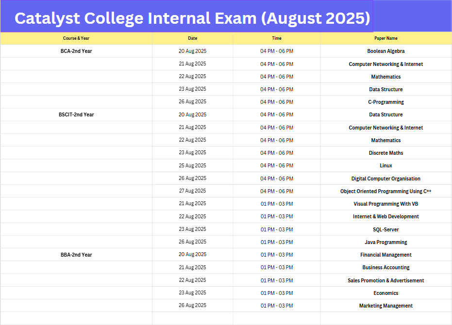All students of BCA, BBA, and B.Sc. IT are hereby informed that the Internal Examination for August 2025 will be conducted as per the academic plan. The detailed examination schedule for August 2025 is attached with this notification. Students are advised to go through the schedule carefully and stay updated through the official website and notice boards.