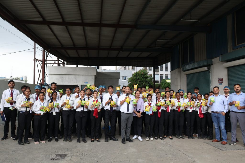 They observed the entire food processing and packaging workflow, including raw material handling, automated production lines, seasoning, packing, and quality control procedures. The visit helped students understand how large-scale food manufacturing units maintain hygiene, consistency, and quality standards.