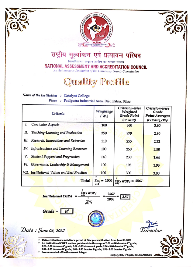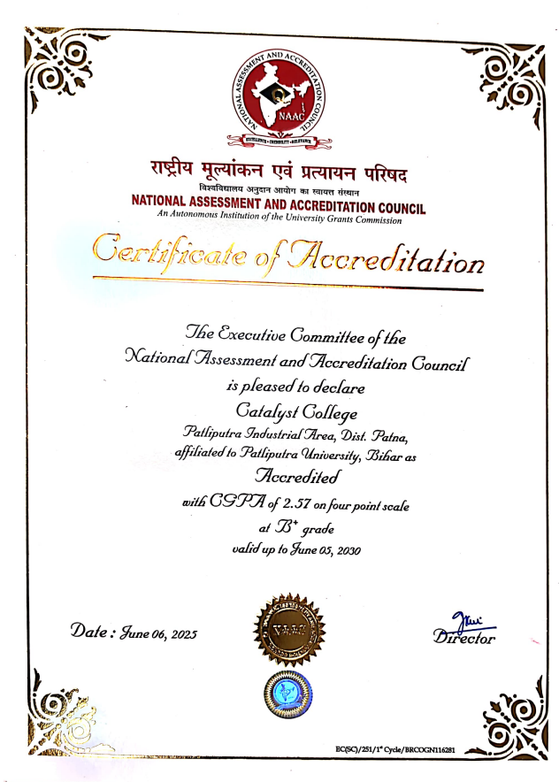 Catalyst College, Patna has been accredited with a B+ Grade by NAAC in its First Cycle, reflecting the institution’s commitment to quality education, academic discipline, and continuous improvement. This accreditation highlights the college’s adherence to national standards in teaching–learning processes, infrastructure, governance, and student support systems.